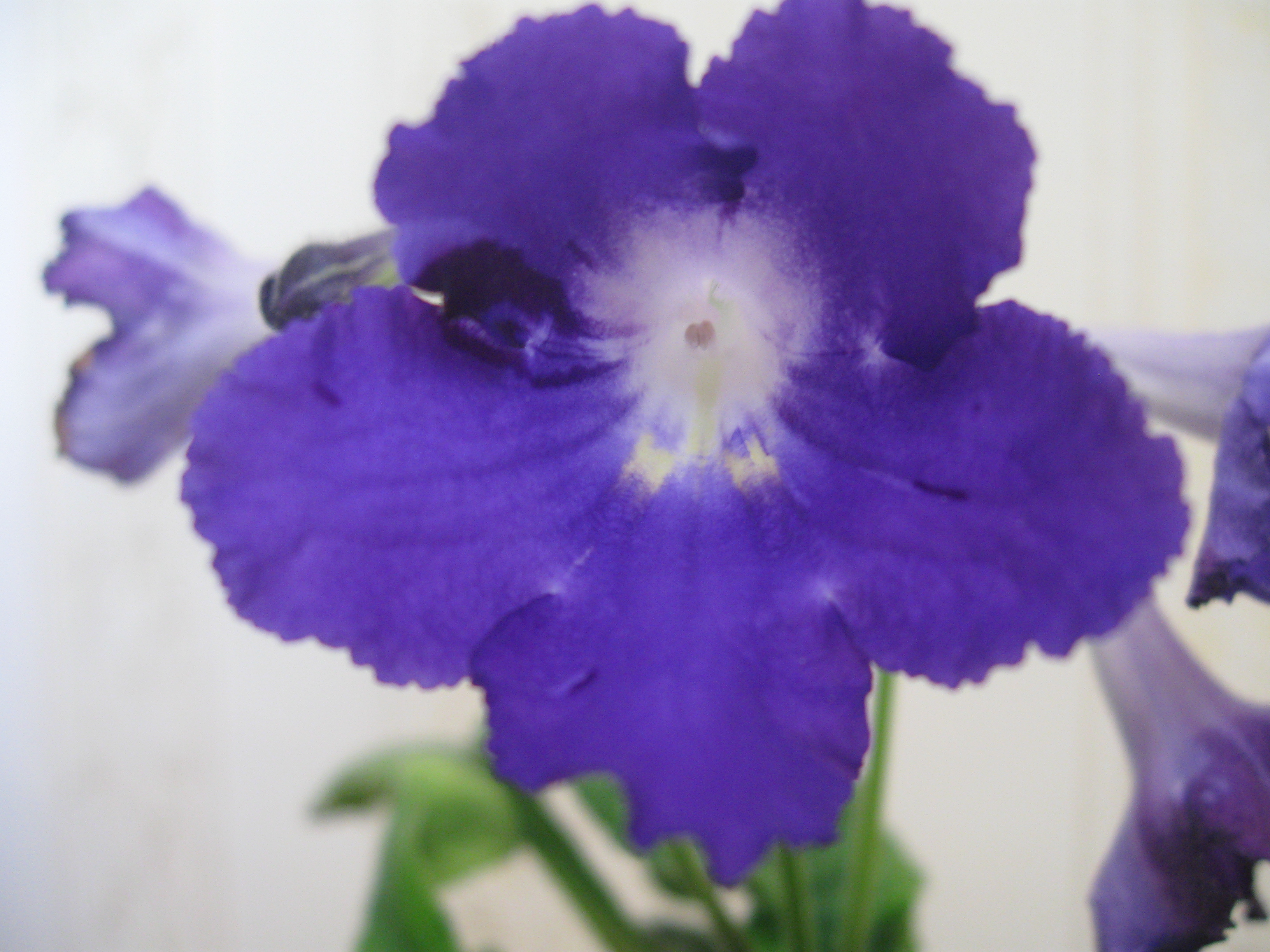 Насыщенно-синие цветы с контрастными полосами более тёмного и светлого тона. Очень компактный куст из тёмно зелёных листьев.